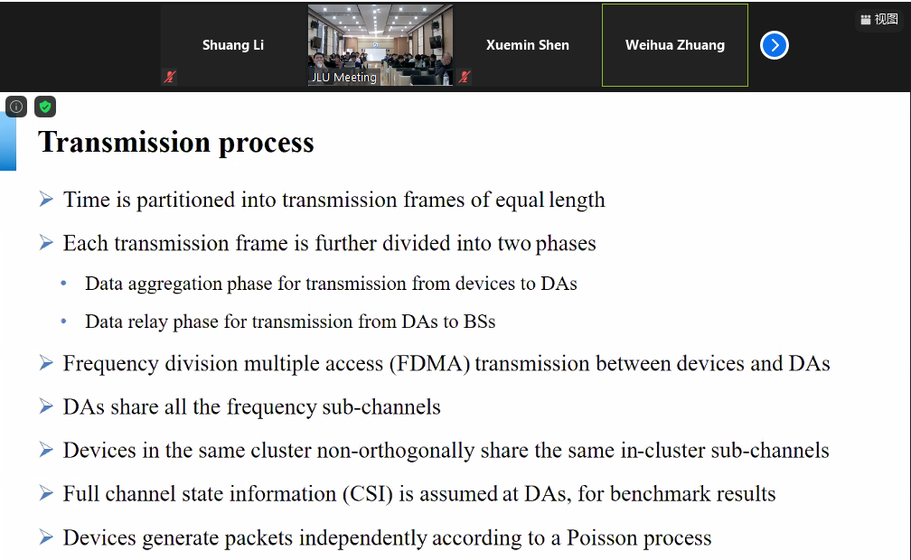 Professor Weihua Zhuang gave an academic report titled “Channel Access Management for Cellular IoT Applications”. He mainly focused on the cut-in channel management of the Internet of Things, and introduced random cut-in and restriction of channels, 2-hop non-orthogonal transmission mechanism and optimization of related data in all aspects. At the same time, he used simulation technology to show that the proposed channel cut-in solution can reduce the cost.