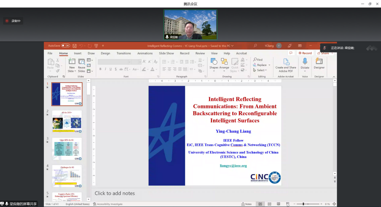 Professor Ying-Chang Liang, Foreign Member of Academia Europaea, Professor of University of Electronic Science and Technology of China, Editor-in-Chief of TCCN, Associate Editor of CHINA COMMUN, and Editorial Board Member of "Science in China-Information Science", delivered a keynote speech entitled "Intelligent Reflecting Communications for 6G"