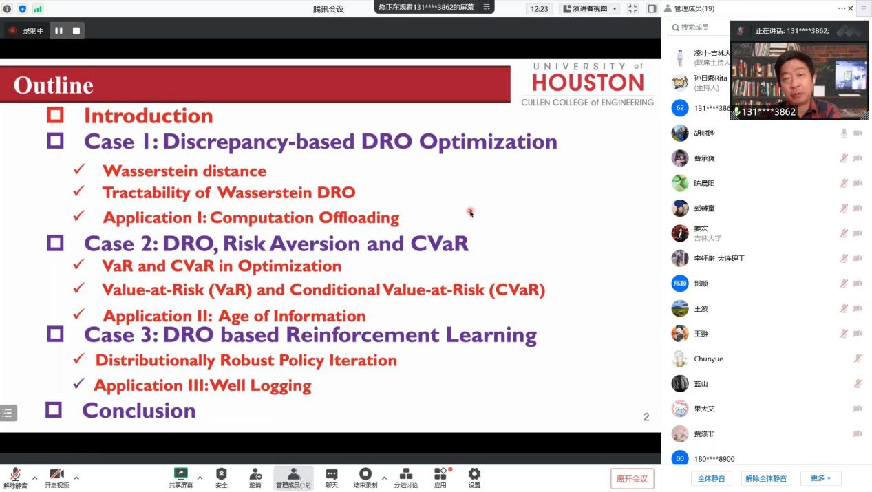 Then, Professor Han gave the lecture. Based on deterministic probability distribution and uncertain probability distribution, he introduced three common optimization methods: stochastic programming, robust optimization and distributed robust optimization. Furthermore, the characteristics, differences and connections of these three optimization methods were introduced, and the scenarios in which they are suitable for application were given. The role of the DRO method and the advantages of its application were summarized. On this basis, Professor Han shared the case studies of three types of DROs, including discrepancy-based DRO optimization, DRO methods using risk aversion and CVaR, and DRO methods based on reinforcement learning. Finally, he elaborated on the motivations for using the DRO approach and outlined the basic kernels of the DRO optimization method, CVaR and DRO RL method.