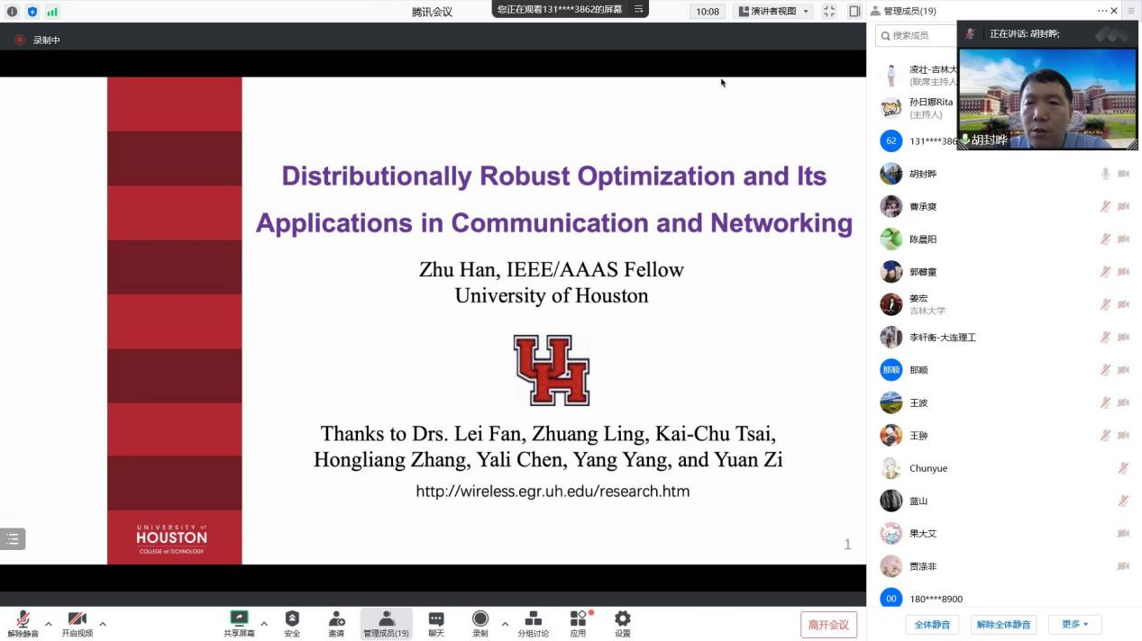 At 9:00 am on August 8th, 2022, the fourth lecture of the lecture series on cutting-edge technologies in information communication and control was successfully held via Tencent platform. Professor Zhu Han of the University of Houston was invited to conduct an online academic exchange entitled “Distributionally Robust Optimization and Machine Learning for Communication Networks” with teachers and students of our College of Communications Engineering. The exchange session was chaired by Professor Fengye Hu.