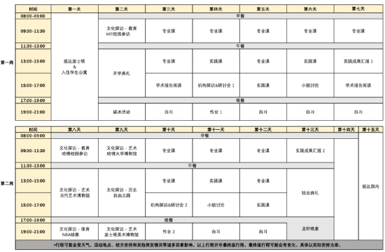 1. 课程计划:Pre-learning(4周)+ On-campus Course(2周)+ Post-learning(4周)。共计10周课程学习计划,包含出发美国前4周Pre-learning,2周在MIT的学习,以及课程结束后4周的Post-learning。